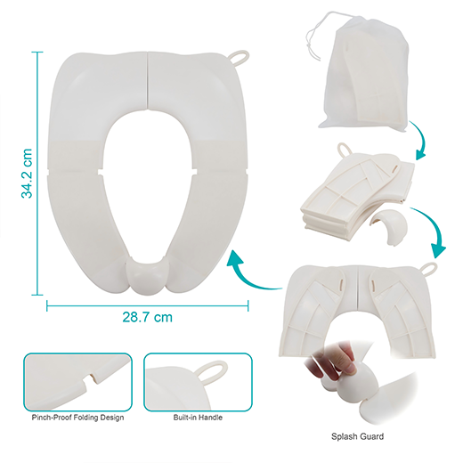 | Features | . Comfort & Safety On the Go: This foldable potty seat is perfect for travel—lightweight, compact, and comes with a washable carry bag that fits easily into your diaper bag. . Secure & Pinch-Free Design: The anti-slip base keeps the seat stable on most toilets, while the pinch-free joint structure prevents your child’s bottom from getting hurt—giving you peace of mind every time they go. . Easy to Clean: Smooth surface wipes clean in seconds—ready for your next stop! |