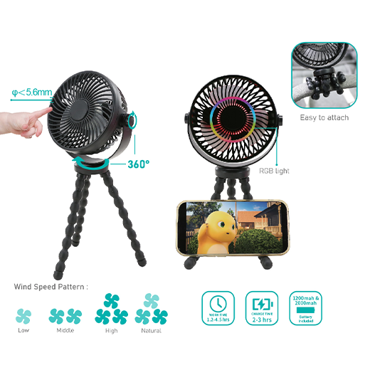 | Features | . Stay cool anywhere with stroller fan. . With adjustable speeds and a 360-degree rotating design, you have complete control over airflow direction. . Operating quietly, fan fits perfectly in your office, travel bag, or home. . Flexible legs allow easy placement anywhere. . Input: 5V-1A(Max). . Battery: 1200mah. . 4 Wind Speed: Low/Mid/High/Natural. . Charging Time: Depends on Input power, 2-3 hours. . Working time: 1.2-4.5 hours. . USB Rechargeable Battery. . Included: 1 x Fan, 1 x USB cable. . With RGB light. |